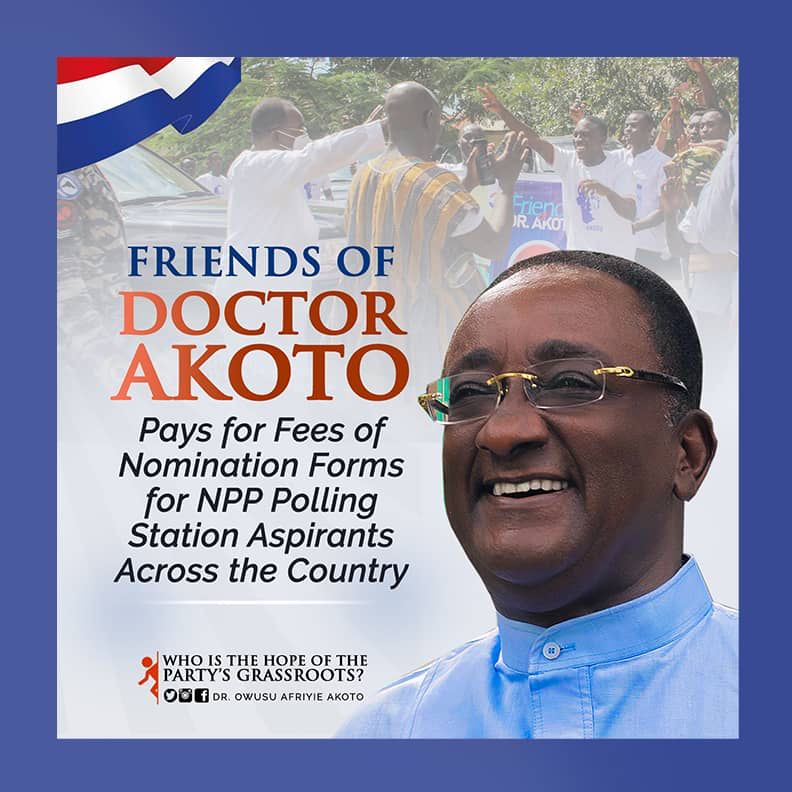 Friends of Dr. Akoto in pursuit of an equal opportunity for all prospective aspirants in strengthening internal democracy has paid for the fees of the nomination forms for all the aspirants of the over 38,000 Polling stations across the country. The payments have been done through the respective regional and constituency representatives of the group.