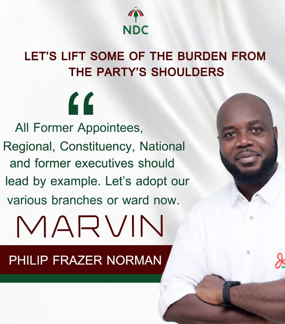 The treasurer should also look for other avenues to help lift the financial and logistical burden off the shoulders of the party and that is the main reason why Chairman Marvin Philip Frazer Norman, former Asokwa constituency chairman and Ashanti Regional Treasurer Hopeful is advocating for former appointees, former and current party executives to adopt branches, wards and even constituencies base on their financial standings to ease the burdens on the constituencies.