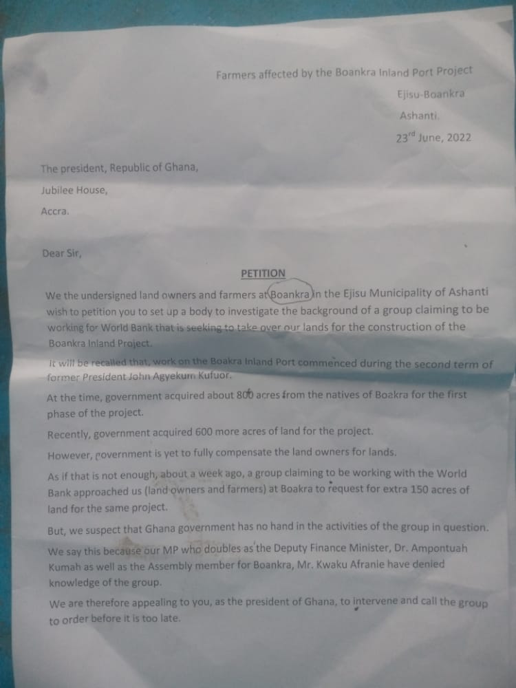 Landowners and farmers at Boankra in the Ejisu Municipality of the Ashanti Region have petitioned President Akufo-Addo, through the Asantehene Otumfour Osei Tutu II, over attempts by some people to take over their lands for the construction of the Boankra Inland Port