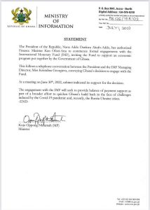 Today, the Information Ministry announced that President Akufo-Addo has directed the Finance Minister, Ken Ofori-Atta, to begin formal engagements with the International Monetary Fund.