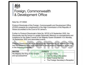 Otumfuo’s invitation was sent through the Ghana High Commission in the UK. By the invitation which includes his wife Lady Julia Osei Tutu, Otumfuo will attend the Queen’s Lying-In-State, the King’s Reception, the State Funeral Services and the Foreign Secretary’s Reception.