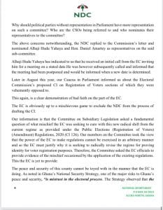The NDC also noted with concern that the ‘No Guarantor’ system the EC intends to adopt is a recipe for manipulation, gerrymandering that can be engineered by ‘paid’ agents or EC officials at their offices because political party representatives who may hitherto challenge or flag persons would have been eliminated.