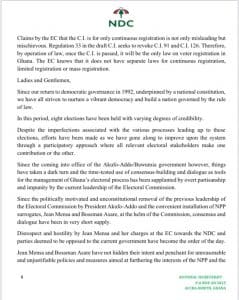 “Since the politically motivated and unconstitutional removal of the previous leadership of the Electoral Commission by President Akufo-Addo and the convenient installation of NPP surrogates, Jean Mensa and Bossman Asare, at the helm of the Commission, consensus and dialogue have been in very short supply. Disrespect and hostility by Jean Mensa and her charges at the EC towards the NDC and parties deemed to be opposed to the current government have become the order of the day.