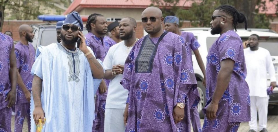 Davido was seen in a blue three piece agbada and flanked by his boys.