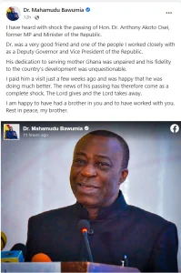 “I have heard with shock the passing of Hon. Dr. Anthony Akoto Osei, former MP and Minister of the Republic. Dr. was a very good friend and one of the people I worked closely with as a Deputy Governor and Vice President of the Republic”.