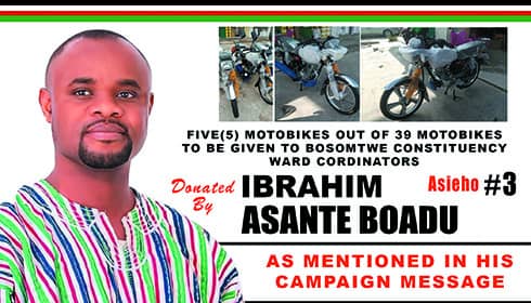 Mr. Ibrahim Asante Boadu the Parliamentary Candidate Hopeful for the NDC in the Bosomtwe Constituency has donated 5 brand new motor bikes to his party.