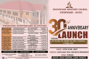 Seventh-day Adventist church, Gyinyase branch is set to launch its 30th Anniversary on 10th June 2023 under the theme: 30 Years of hope in his coming : I will go.