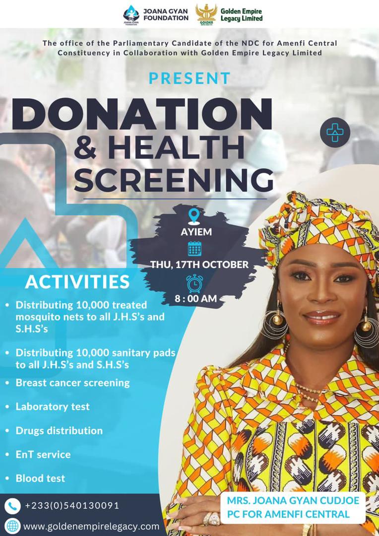 In a significant health initiative aimed at supporting Junior and Senior High School students, Joana Gyan Cudjoe, the National Democratic Congress (NDC) parliamentary candidate for Amenfi Central, has announced a series of community health events scheduled to run from Tuesday, October 15 to Sunday, October 20, 2023. The initiative will address pressing health issues such as malaria, menstrual hygiene, and general well-being through the distribution of treated mosquito nets, sanitary pads, and health screening services.