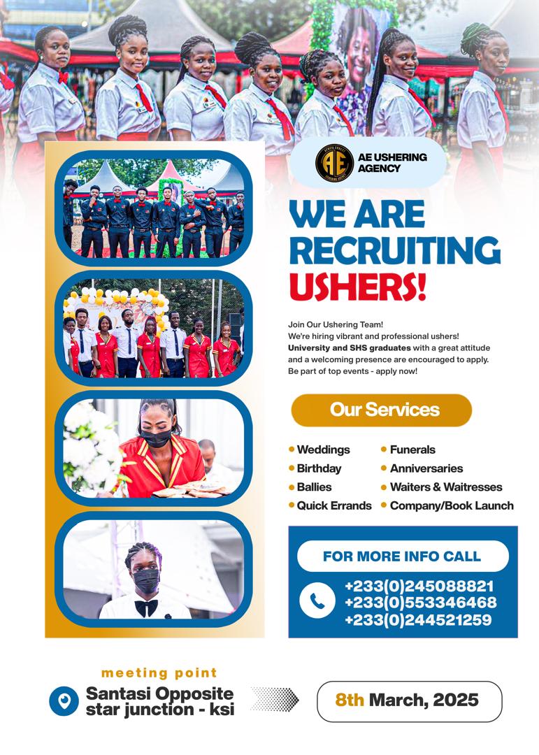 Are you a vibrant and professional individual looking for a new challenge? Do you have a great attitude and a welcoming presence? Look no further, AE Ushering Agency, led by Chief Executive Officer Mr. Ernest Afrifa, is recruiting male and female ushers to join their dynamic team.