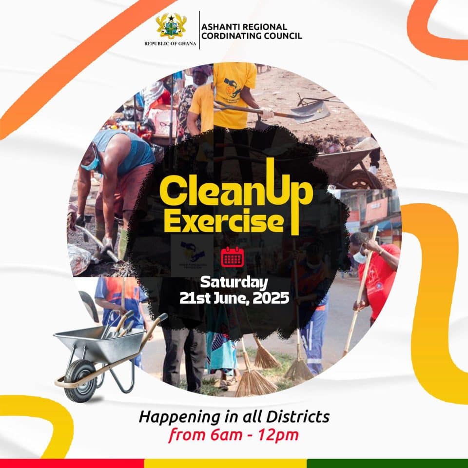 The Ashanti Regional Coordinating Council (ARCC), under the leadership of the Ashanti Regional Minister, Hon. Dr. Frank Amoakohene, has officially announced a region-wide clean-up exercise across all Metropolitan, Municipal, and District Assemblies.
