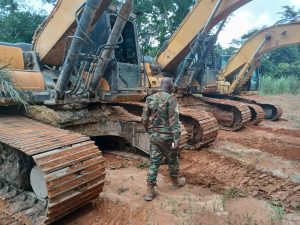 Upon spotting the task force, the illegal miners fled the scene, with some crossing the river to evade arrest. The Task Force, however, confiscated five (5) excavators, which were handed over to the Assin North District Assembly, and immobilized three (3) excavators entrenched at the site. Makeshift structures were demolished, and equipment—including generators, pumping machines, and changfans—was destroyed. An ID card belonging to one Mr. Cobinah Timothy was recovered, potentially aiding further investigations.
