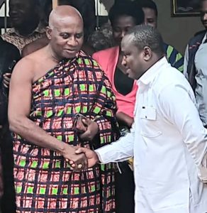 The District Chief Executive (DCE) for Ahafo Ano South West, Hon. Abubakar Sedik has paid a courtesy call on Otumfuo Hiahene, Nana Prof. Oheneba Boachie-Adjei Woahene II, as part of efforts to strengthen collaboration between the District Assembly and traditional authorities for the development of the area.